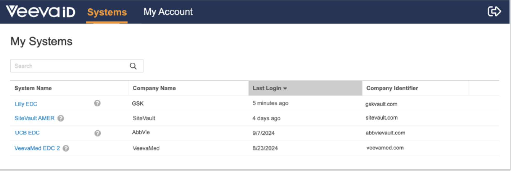 Upon logging into VeevaID, you are directed to the Systems page. It shows a list of all systems to which your VeevaID account has access. Click a System Name to access that system.